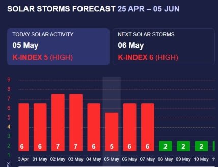 Так, за даними Meteoagent, сьогодні Землю атакує сильна магнітна буря. Її К-індекс (градація потужності) складає 5 балів – сильний геомагнітний шторм. Однак, це ще не все. Вже завтра потужність бурі збільшиться ще на 1 бал і складатиме вже 6 балів із можливих 9. Під таким тиском геомагнітне поле нашої планети перебуватиме 2 дні. Затишшя прийде лише 8 травня.