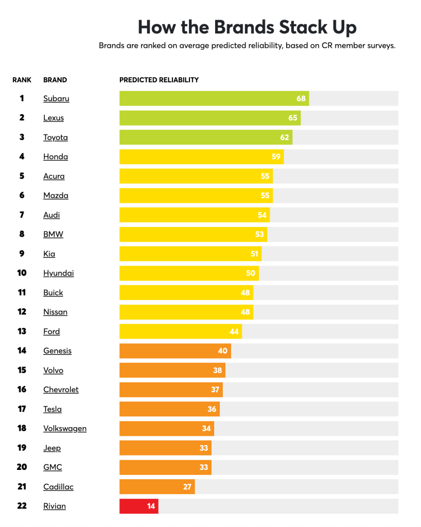 «Хоча рейтинги брендів можуть допомогти вам вибрати автосалон, вкрай важливо також звернути увагу на надійність конкретних моделей, перш ніж приймати рішення про покупку», — зазначив Джейк Фішер, старший директор з автомобільного тестування в Consumer Reports.