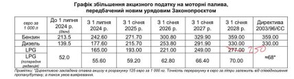Зауважимо, що 250 євро — це акциз, який вступить в дію аж 1 січня 2028 року. Підвищення відбуватиметься поступово, і з 1 вересня 2024 року він складатиме 165 євро. За попередніми оцінками експерта паливного ринку Артема Куюна, це спричинить зростання ціни автогазу приблизно на 5 гривень.