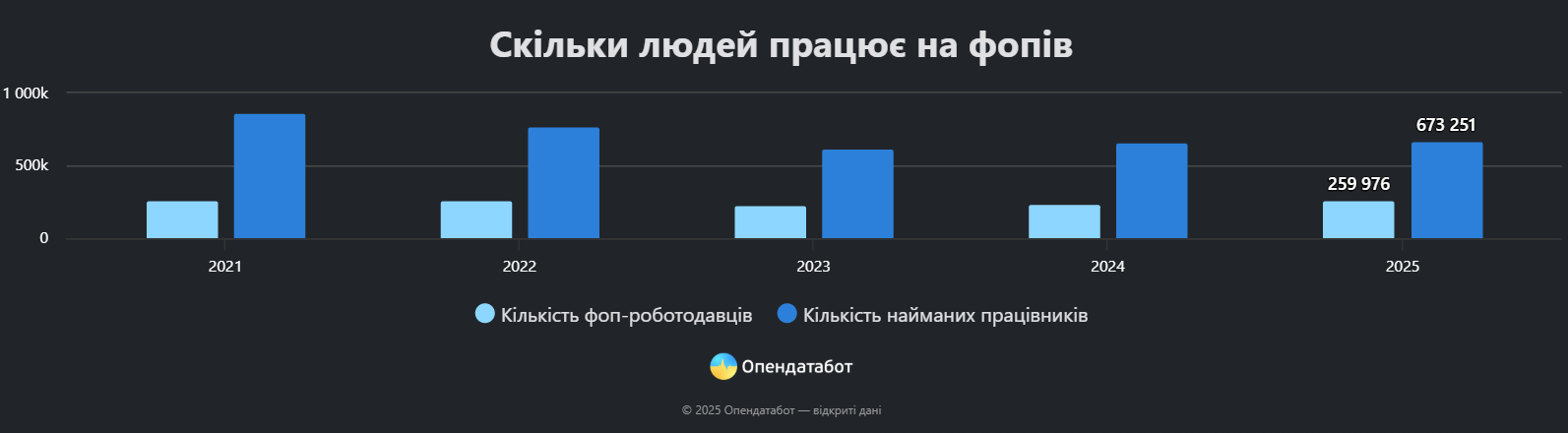 За рік кількість підприємців із найманими працівниками зросла на 9%. Водночас на 259 тис. ФОПів нині працює 673 тис. осіб – це на 13% менше, ніж до початку повномасштабної війни.