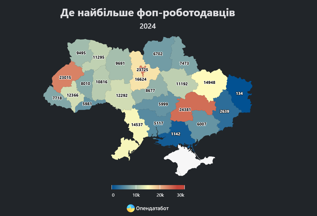 Найбільше підприємців, які наймають працівників, зафіксовано у Дніпропетровській області – 24 тис., що становить 9% від загальної кількості. Київ та Львівщина розділили друге місце з показником по 23 тис. таких ФОПів.