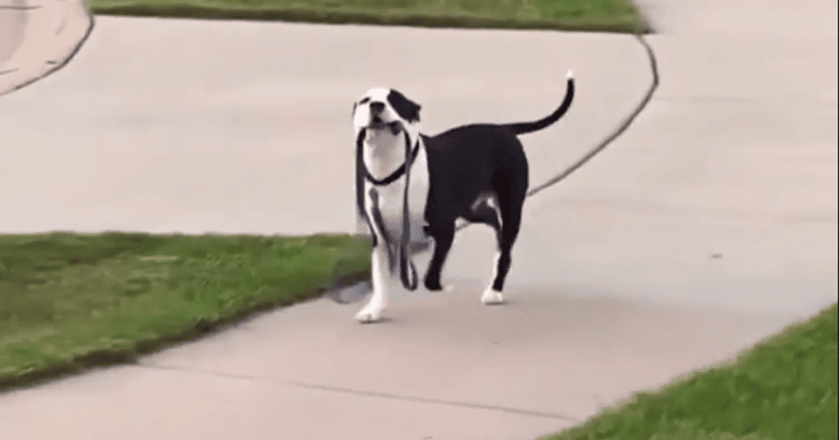 В одному з американських міст місцева жителька спостерігала незвичною ситуацією — сусідський пес біг доріжкою без супроводу господаря. Свій повідець він тримав у зубах із високо піднятою головою.