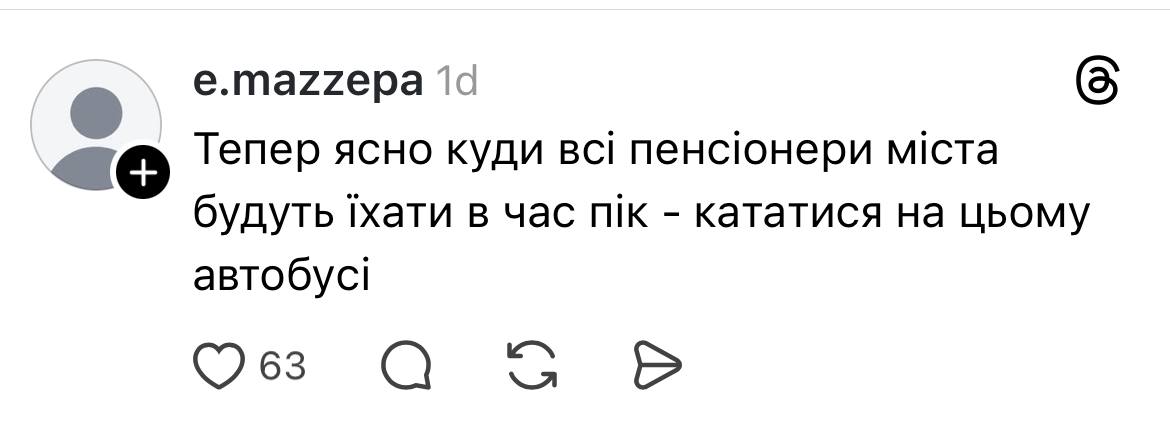 У коментарях користувачі жартували про те, що тепер всі бабусі будь кататися у цьому автобусі, а також, що в ньому мають бути й лежачі місця. Також писали, що скоро з’явиться новина, як цей автобус не проїхав під якимось столичним мостом.