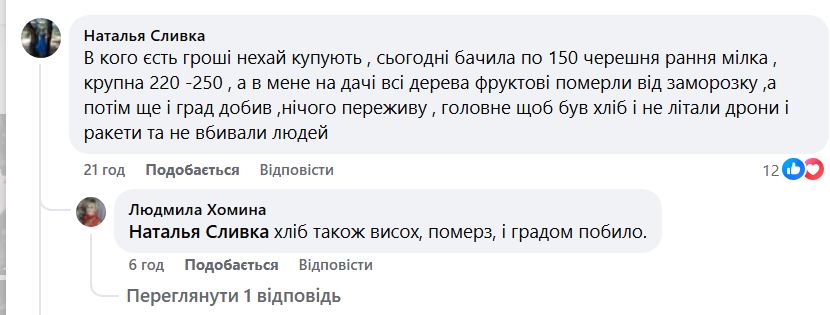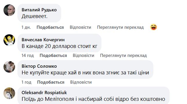 Є також користувачі, які оптимістично прогнозують падіння цін: «Почекайте ще місяць, і буде по 150 за кг». З’явилися й порівняння з цінами в інших країнах, що лише підкреслює ситуацію: «У Канаді 20 доларів коштує кг», «Поруч у Молдові вона вже коштує 150-200 грн».