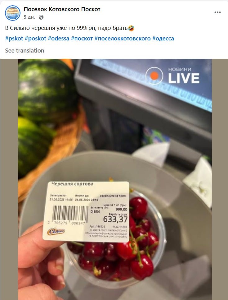 В Одесі активно обговорюють захмарну ціну на першу черешню у супермаркеті «Сільпо». Фотографія, на якій видно цінник у 999 грн за кілограм, викликала хвилю обурення та численні жартівливі коментарі серед користувачів соцмережі.