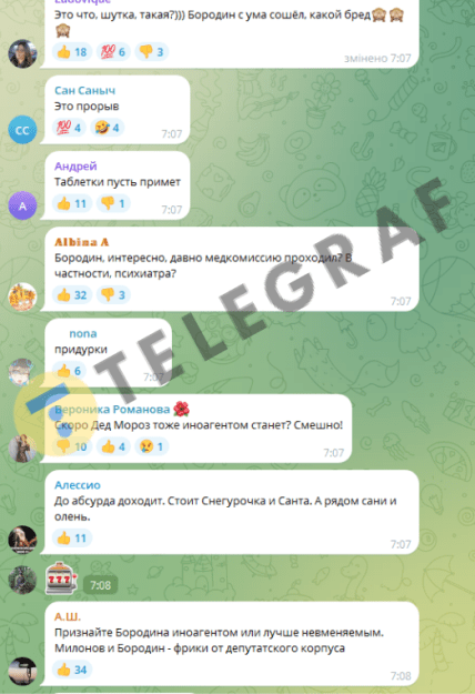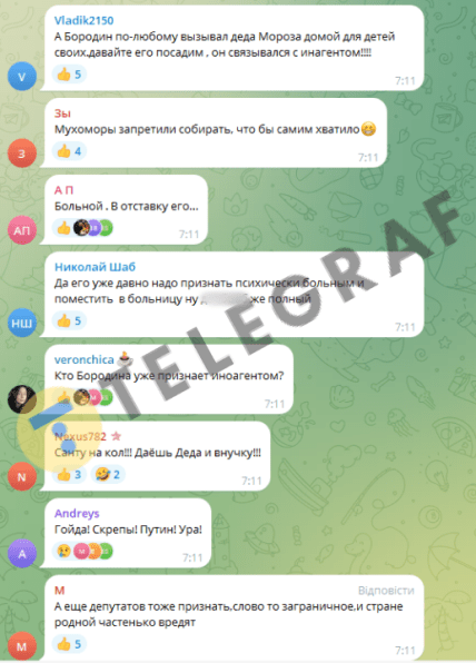 Мережа вибухнула коментарями щодо абсурдності такої ініціативи. Користувачі жартують про те, кого росіяни наступного разу оголосять іноагентом, та пропонують визнати іноземними агентами північних оленів і різдвяних ельфів.