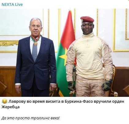 Так, за даними РосЗМІ, нагороду Лавров отримав із рук тимчасового президента Ібрагіма Траоре. Нею є найвища державна нагорода Буркіна-Фасо під назвою “Орден Жеребця”. Таку нагороду можуть отримати громадяни республіки та іноземці за заслуги перед нацією.