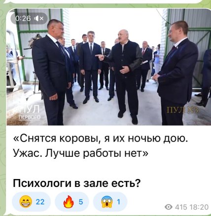 “Кращої роботи немає, запам’ятайте. Я це все пройшов, і знаю. Мені сняться вночі зараз люди з якими я працював, тварини. Я їх дою, доглядаю. Жах. Кращої роботи, ніж тут (на комплексі — Ред.) немає. Президентство то чепуха“, — сказав Лукашенко.