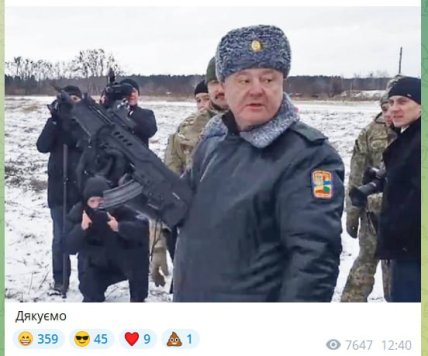 Фото Петра Порошенка зі зброєю та напис “Дякуємо” додають іронії, ніби натякаючи на можливу роль екс-президента в інциденті.