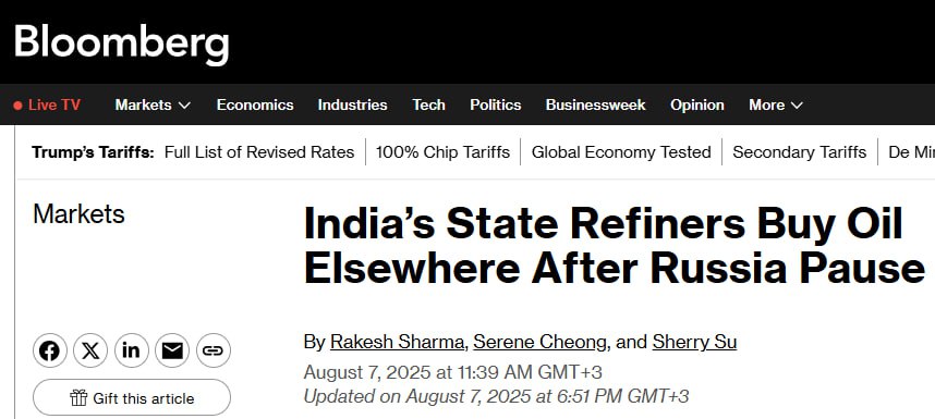 Індійські державні нафтопереробні заводи (НПЗ) призупинили закупівлю російської нафти після того, як США запровадили 25% тарифів на імпорт з Індії.