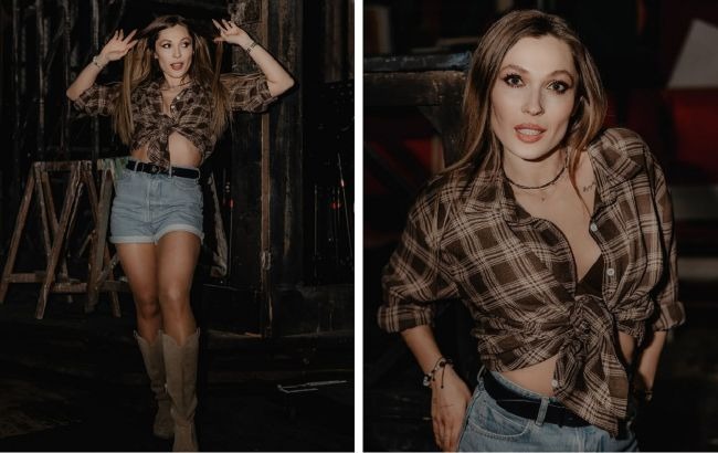 З джинсовими шортами вона вирішила одягнути коричневу сорочку в клітинку. Її Світлицька зав’язала на вузол, зробивши таким чином акцент на тонкій талії.