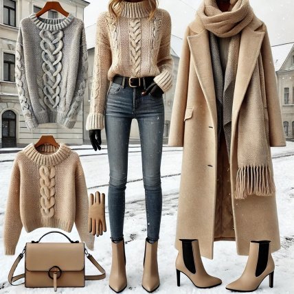 • Карамельне шерстяне пальто, в’язаний светр oversize, спідниця міді з еко-шкіри.