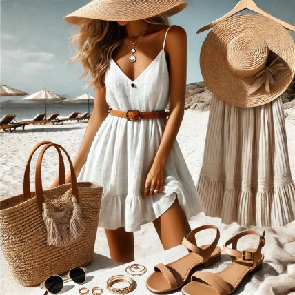 • Біле лляне плаття-сорочка до коліна, широкополий солом’яний капелюх.