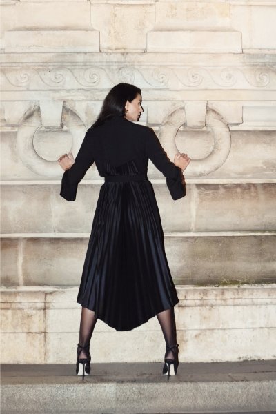 У новорічну ніч Андре Тан пропонує одягати сукні-тренчі з повністю гофрованою шовком спиною, зручні топи та комбінезони з декоративним плюмажем, штани разом із сорочками та жакетами, а також сукні: в’язані або асиметричні. Моделі виконані в чорному кольорі, у них дуже легко зловити паризький вайб або відчути себе героїнею фільмів французької “нової хвилі”.