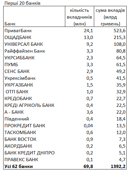 За даними НБУ, у державному ПриватБанку було 24,1 млн вкладників, які зберігали 523,6 млрд гривень. На другому місці державний Ощадбанк – 13,0 млн вкладників, сума – 215,3 млрд гривень, на третьому приватний Універсал банк – 9,2 млн вкладників, сума – 108,0 млрд гривень.