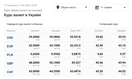 За даними порталу “Мінфін”, у суботу, 11 травня, середній курс долара в українських банках становить 39,50 грн (купівля) та 39,98 (продаж). Готівковий курс — 39,82 (купівля) та 39,93 (продаж). У той же час офіційний курс Національного банку України становить 39,55 грн.