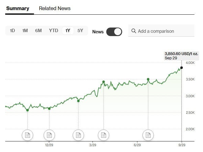 Ціна на золото досягла історичного максимуму, перевищивши позначку у $3853 за тройську унцію.