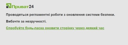 Приблизно через 10 хвилин після появи помилки на сайті “Приват 24” з’явилося повідомлення про те, що в цей час проводяться регламентні роботи з оновлення системи безпеки. Там закликали обновити сторінку пізніше.