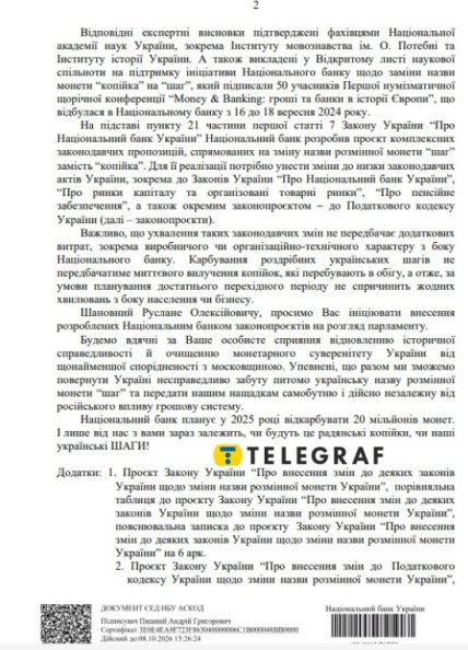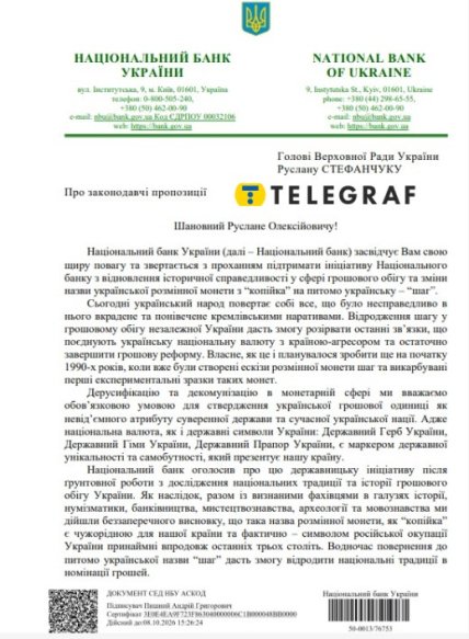 У Мережі з’явився лист від НБУ до спікера Верховної Ради Руслана Стефанчука щодо перейменування копійок на шаги. У документі Нацбанк просить підтримати ініціативу з “відновлення історичної справедливості” у сфері грошового обігу. НБУ аргументує, що назва “копійка” є чужорідною для України та символом російської окупації протягом останніх трьох століть. Опублікував лист нардеп Данило Гетманцев.