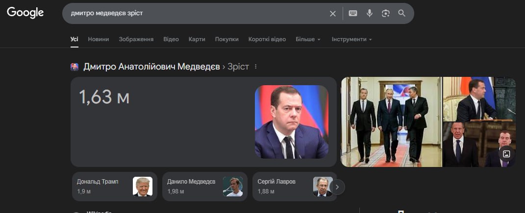 Заступник голови ради безпеки РФ Дмитро Медведєв зустрівся у Пхеньяні з лідером Північної Кореї Кім Чен Ином, де подякував йому за участь військових КНДР у боях у Курській області. Вони зробили спільне фото, на якому майже одного зросту, хоча за деякими даними, зріст лідера КНДР нібито 170 см, а Медведєв значно нижчий.