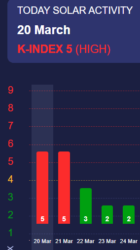 Водночас ймовірність малої геомагнітної бурі 20 березня становить 25%, а великої геомагнітної бурі — 5%. Існує 40% ймовірності бурі класу М та 5% ймовірності бурі класу Х в цей день.