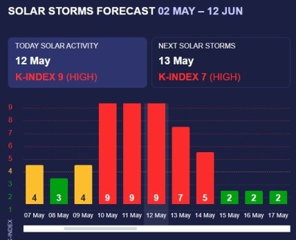 Повідомляється, що вже завтра його К-індекс (градація потужності) становитиме 7 балів (максимум 10 балів, сьогодні 9 балів). Втім, такі показники все ще вважаються дуже сильною магнітною бурею. А вже 14 травня шторм вщухне до 5 балів – сильна магнітна буря.