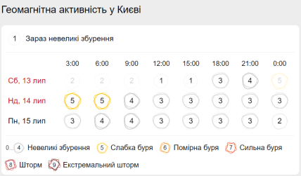 Протягом 8-14 липня прогнозуються одноденні геомагнітні шторми 4 балів, які мають протриматись на початку, в середині та в кінці тижня.