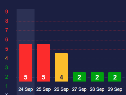 Згідно з графіком “Попередження про сонячні спалахи та шторми” на сайті Meteoagent, у період цих днів варто очікувати на шторм 5 та 4 балів.