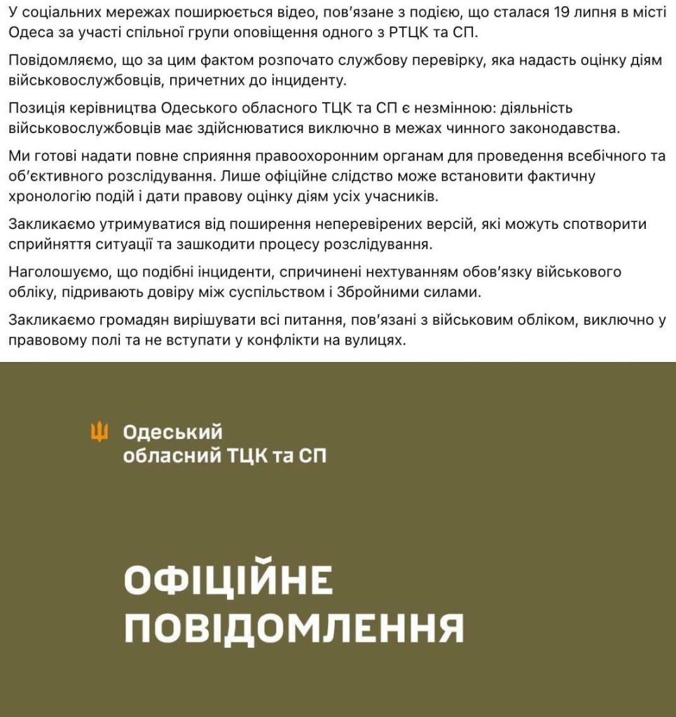Також у ТЦК зазначили, що проводять службову перевірку та пообіцяли надати всі необхідні свідчення правоохоронцям.