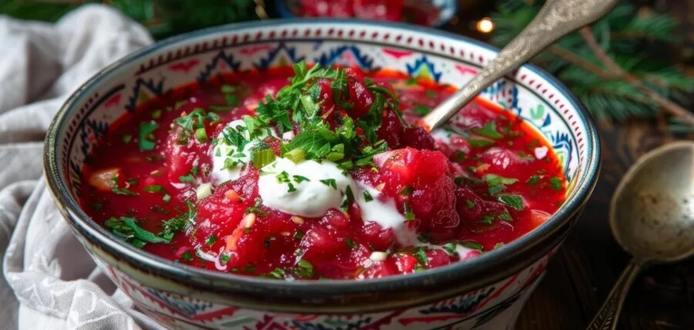 Борщ – традиційна українська страва, основа якої – м’ясний бульйон, овочі, обов’язково – буряк і капуста. При подачі обов’язково додавайте сметану та зелень.