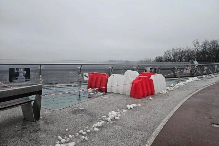 «Скляні конструкції мосту виготовлені з багатошарового триплексу, що забезпечує їхню безпечність навіть у разі пошкодження. Водночас процес заміни скла вимагає стабільної плюсової температури», – інформують в КМДА.