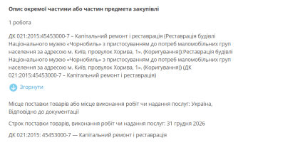 Національний музей “Чорнобиль” розпочав пошуки підрядної організації, яка проведе ремонт та реставрацію будівлі музею, а також зробить її доступною для маломобільних груп населення.