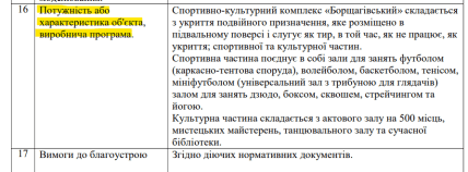 Також у тендерній документації зазначено, що спортивно-культурний комплекс “Борщагівський” складатиметься з укриття подвійного призначення, спортивної та культурної частин.