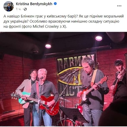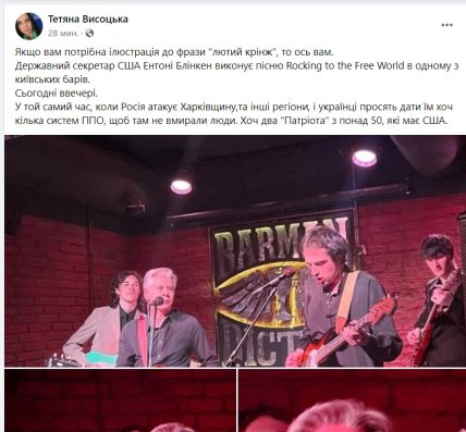 Державний секретар США Ентоні Блінкен після обіду у культовій піцерії Києва відірвався у барі “БарменДиктат”. Разом із гуртом він виконав популярну пісню Ніла Янга.
