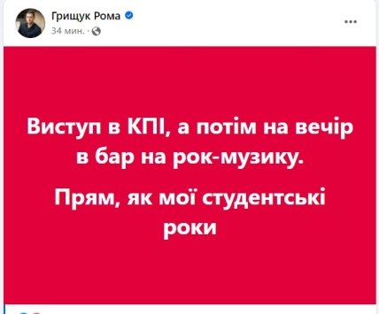 “Виступив у КПІ, а ввечері до бару на рок-музику. Прям як мої студентські роки”, — написав народний депутат України Роман Грищук.