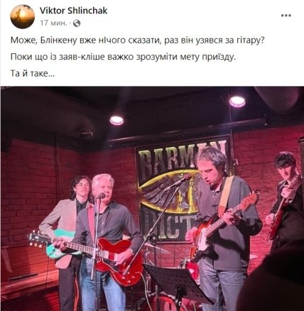 “Блінкен грає у київському барі. Добре грає. І бар гарний. А сам Блінкен красава. Але в мене якесь дивне відчуття від усього, що відбувається, загалом. Особливо бачучі на події на фронті. Якийсь театр абсурду”, — написав він.