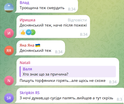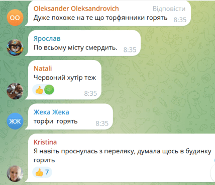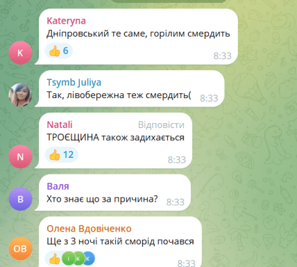 “Дніпровський район горілим смердить”, “Так, лівобережна теж смердить”, “Троєщина також задихається”, “Ще з 3 ночі такий сморід почався”, “Деснянський теж, як після пожежі”, “Пишуть торфовища горять … але щось не схоже”, “З ночі думав, що сусіди курять.. вийшов, а тут скрізь”, “Дуже схоже на те, що торфовища горять”, “По всьому місту смердить”, “Я навіть прокинулася з переляку, думала щось у будинку горить”, — пишуть жителі Києва.