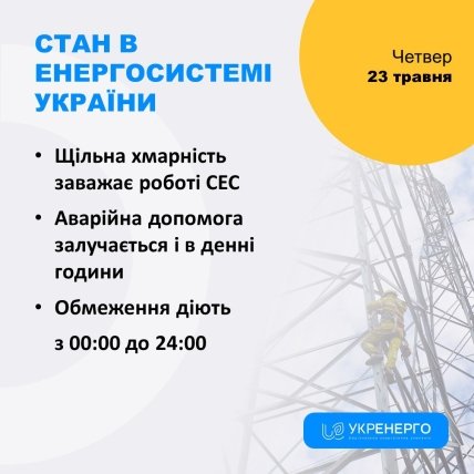 У четвер, 23 травня, у Києві застосовують графіки стабілізаційних відключень світла. Вони діятимуть весь день, тобто до 00:00, і для промислових, і для побутових споживачів.