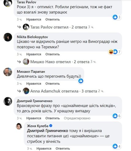 “Як думаєте, на скільки місяців/років затягнеться ремонт перегінного тунелю між станціями “Деміївська” та “Либідська”? Накидайте ваші варіанти в коментарях! Поки заплановано 6 місяців. Закривають шість!!! станцій метро: “Деміївська”, “Голосіївська”, “Васильківська”, “Виставковий центр”, “Іподром”, “Теремки”. Натомість обіцяють організувати громадський транспорт… який зупиняється під час повітряних тривог. Ще можете накидати в коментарях лайфхаки для тих, хто уникав маршруток, обираючи метро, як проїхатися в маршрутці, заплативши легально, наприклад”, — написала депутатка Київради Євгенія Кулеба у себе в Facebook-акаунті.