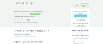 Другий тендер на закупівлю 625 пачок офісного паперу А4 (по 500 аркушів у кожній) на суму 125 тисяч гривень. Про це стало відомо з електронної системи публічних закупівель “Prozorro”.
