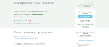 Київська обласна рада оголосила два тендери на загальну суму 620 тисяч гривень. Один з них – на закупівлю міжмережевого екрана “фаєрвол” за 495 тисяч гривень.