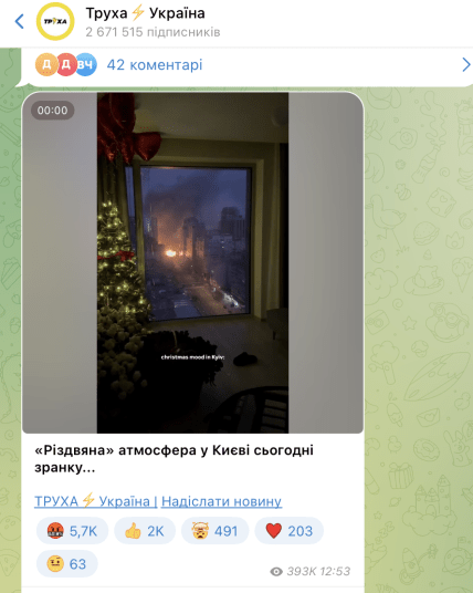 “”Різдвяна” атмосфера у Києві сьогодні зранку…” — написав канал “Труха Україна” з авдиторією майже в 3 мільйони читачів.