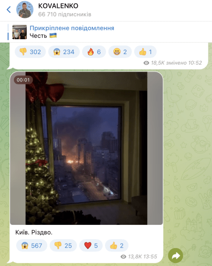Керівник Центру протидії дезінформації (ЦПД) РНБО Андрій Коваленко теж додав ці кадри на свою сторінку, підписавши: “Київ. Різдво”.
