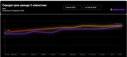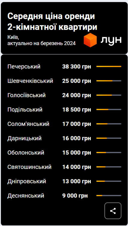 Найдоступніші ж квартири для оренди можна знайти у Святошинському (14 000 гривень), Дніпровському (13 000 гривень) та Деснянському (9 000 гривень) районах столиці.