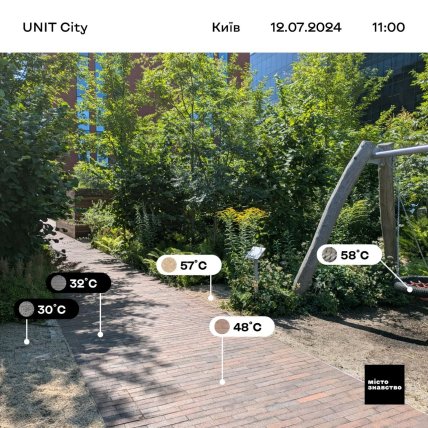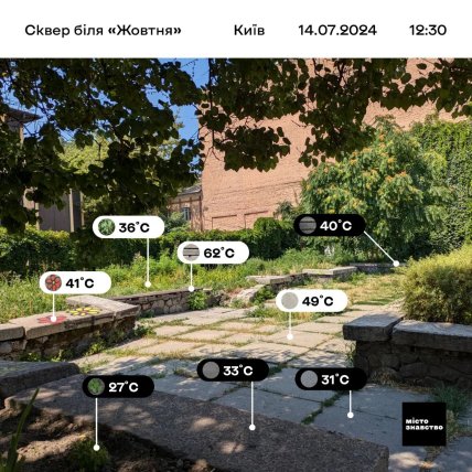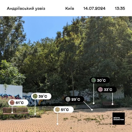 Дуже високу температуру зафіксували у парку на Володимирівській гірці. Надгарячою виявилася лавка — +65°C.