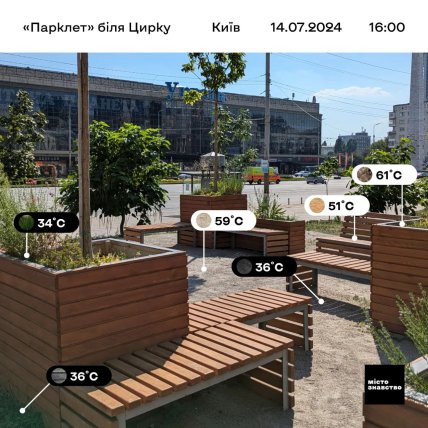 Урбаністична ініціатива “Містознавство” провела цікаве дослідження, використовуючи інфрачервоний пірометр. Так, з’ясувалося, що парклети біля Цирку розжарилися до +60°C.