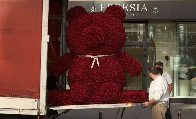 У Києві зробили оригінальне флористичне замовлення — букет у вигляді ведмедика заввишки понад два метри, складений із сотень червоних троянд. Його продали за 536 000 гривень. Про рекордну покупку повідомила флористка Анастасія Скальницька.
