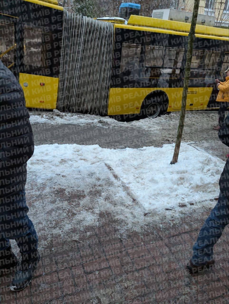 У Києві на вул. Софіївській 7 січня під асфальт частково провалився тролейбус. Через пошкодження покриття на проїжджій частині вулиці тимчасово призупинено рух тролейбусів і автотранспорту.