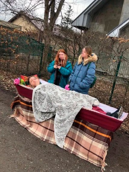Авторка оголошень пішла далі та опублікувала відповідні фото. На опублікованих кадрах помітно, що посеред вулиці стоїть труна, в ній лежить людина, а також поруч стоять близькі.