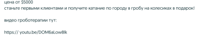 Вартість такої послуги зазначена 5 тисяч доларів. Серед послуг: лежання в труні, забивання труни цвяхами, родичі та друзі вимовлять свої некрологи, опускання труни в землю та присипання землі, закопування, поминки з пиріжками, плакальниці.
